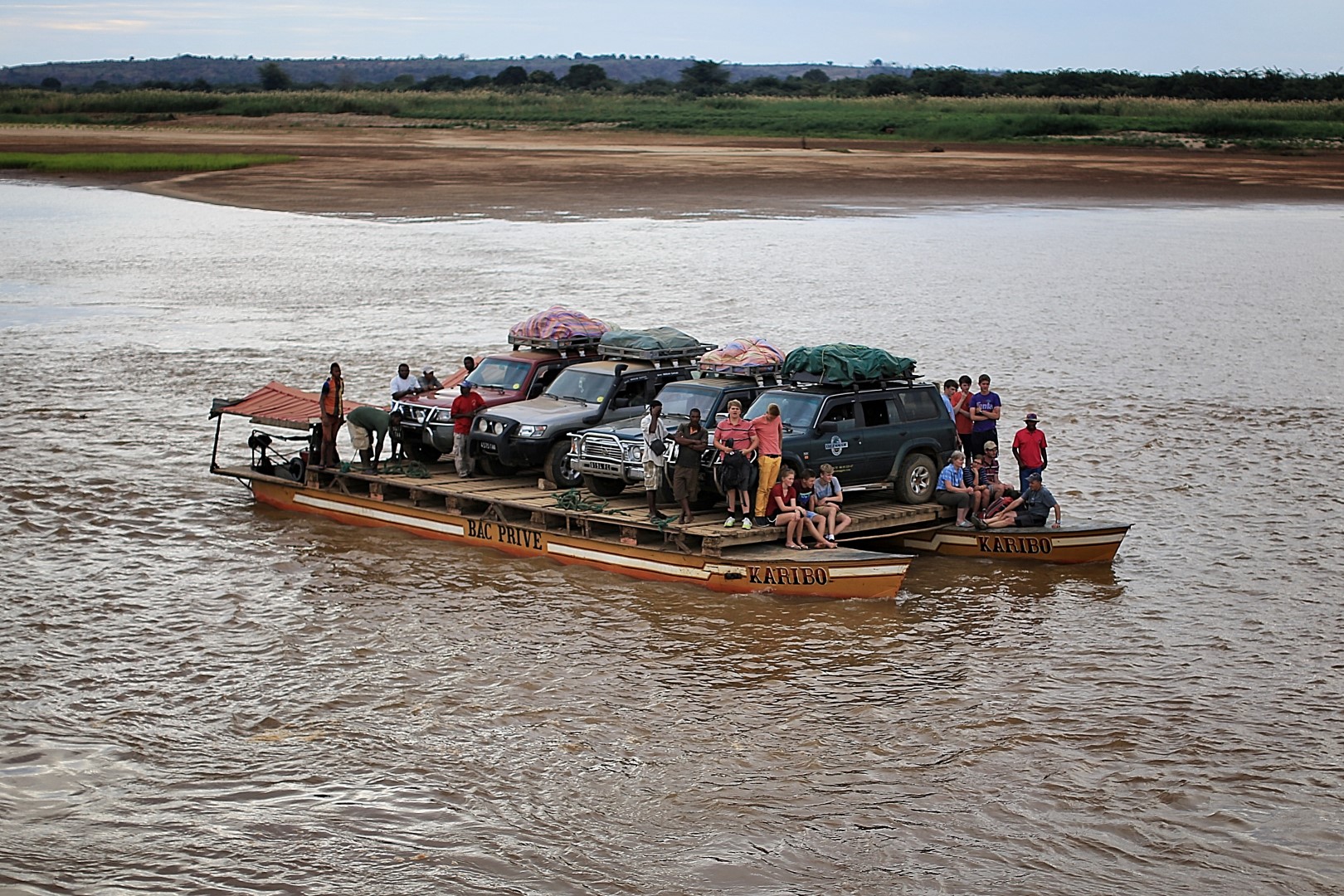The tourist SUV's on this ferry are riding the same boat which takes supplies to a million people.