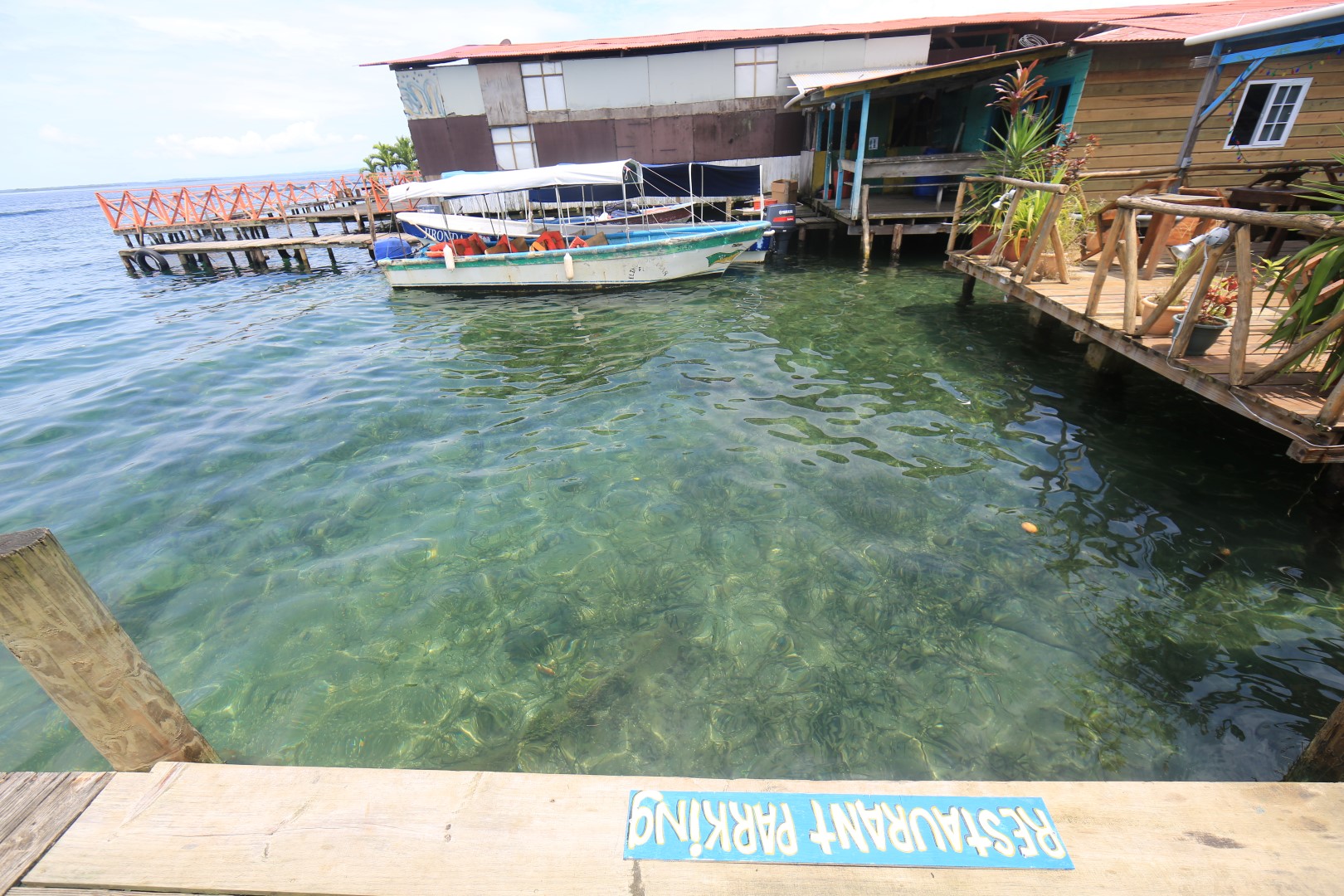 After I allowed myself to absorb that the rough veneer wasn’t as bad as first glance  I allowed for the geography of the place to take over and fill my senses.  My B&B included a beach cruiser bike in the price.   Bocas is infinitely bikeable.  There aren’t that many cars (although there are cars) and a lot of people are on bikes and are walking.   There were miles of flat jungle road with beaches along the edges.  IMGL7886 There is water all around.  There are boats all around.    Jungle canopy, big bays, swimming beaches, surfing beaches, more jungle.   There’s the town with a pretty good number of decent restaurants.   Many of the restaurants are basically docks facing out onto the water.    Service is mediocre everywhere you go.   Don’t expect your food to come too quickly but on the other hand it’s not so bad that you get upset about it – and hey, really, what’s the rush?  You are sitting on a dock waiting for some delicious fish or a shrimp salad right?IMGL7919
