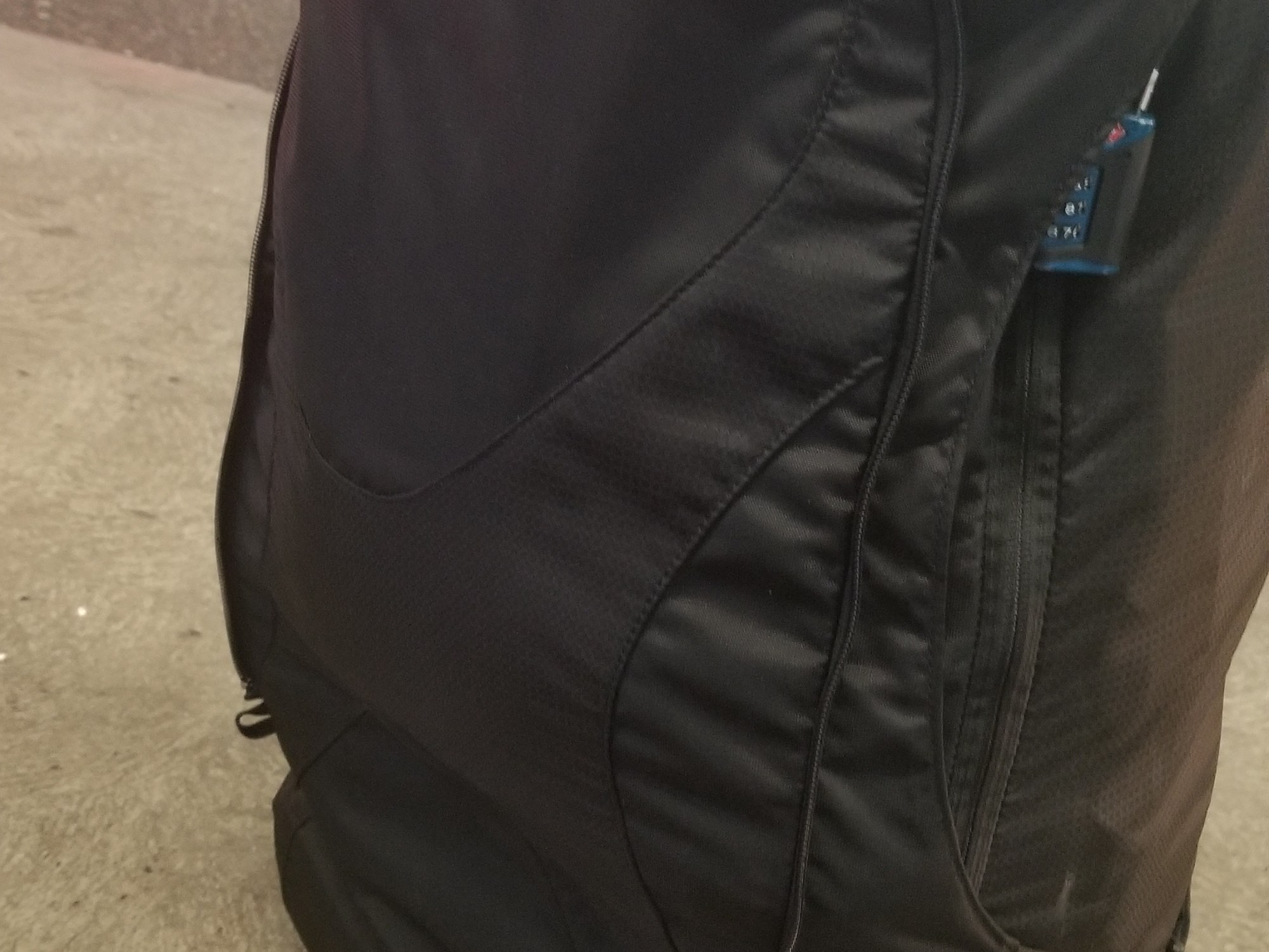 I got to baggage claim in LAX and my heart stopped. I knew my bag but the attached backpack was a gone. I knew without question it had been securely fastened when I checked it. I grabbed the bag and nothing was ripped or torn. The half of the zipper on the face for the bag – probably 2 feet of zipper – was in perfect condition. No broken teeth, etc. My heart dropped. It had to have been purposely removed. You can see the zipper, imagine that there was a backpack attached.